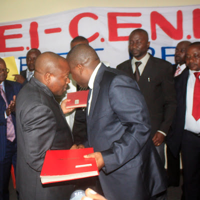 De gauche à droite Abbé Apolinaire Malu Malu et le Pasteur Ngoy Mulunda, en poignet des mains, s’échangeant des documents ce 3/3/2011 lors de la remise et reprise Cei-Ceni