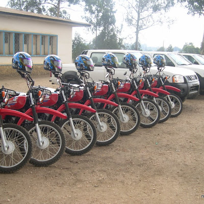 5 jeeps et 20 motos, don de Caprikat et Foxwhelp à la police nationale congolaise de l’Ituri à Bunia le 24 janvier 2010.