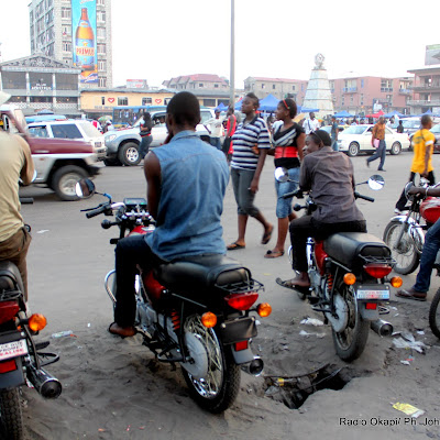Place des artistes, Rond-point victoire/ Kinshasa. Le trafic routier n’est pas intense ce 2/06/2011. Quelques motards discutent en attendant l’arrivée des passagers. Ici, comme dans d’autres carrefours, les motos qui font le taxi n’ont pas toutes des plaques d’immatriculation.