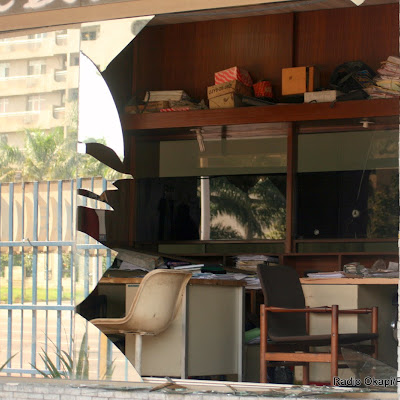 Des bureaux situés au réez des chaussées de l’immeuble de la Regideso sur le boulevard du 30 juin à Kinshasa/Gombe, dont les vitres sont cassées sous l’effet de fortes détonations de Brazzaville, dimanche 4/03/2012. Radio Okapi/Ph.