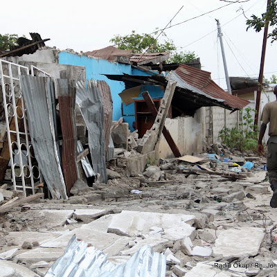 Un militaire marche aux cotés de sa maison à gauche, détruite par des détonations causées par l’incendie du camp militaire le 5/3/2012 à Brazzaville. Radio Okapi/ Ph. John Bompengo