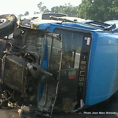 Un bus mercedes 207 renversé sur le boulevard Lumumba au niveau du quartier 1 à Kinshasa (Mars 2012)