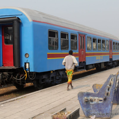 Un homme passe devant des voitures de train urbain de la SNCC à la gare centrale à Kinshasa. Radio Okapi/ Ph.