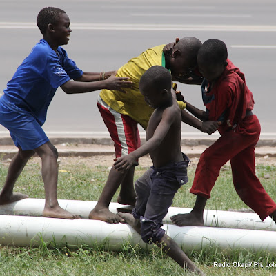 Des enfants sans demeure fixe (shégués) jouent en face du siège de la Ceni le 12/10/2011 à Kinshasa. Radio Okapi/ Ph. John Bompengo