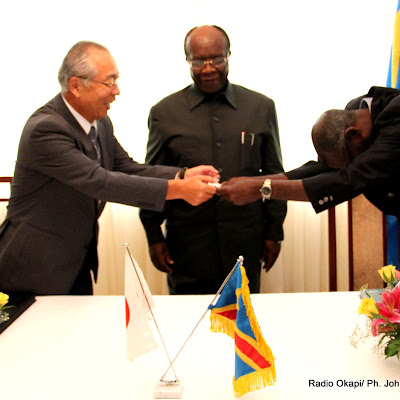 A gauche, l’Ambassadeur du Japon, Yoshimasa Tominaga et la partie congolaise représentée par le Ministre Mashako Mamba au centre le 29/02/2012 à Kinshasa, lors de la signature du contrat pour le Projet de construction du complexe Japon-Congo à l’ISP-Gombe. Radio Okapi/Ph.