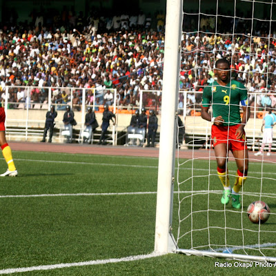 Le but des lions indomptables du Cameroun (vert-rouge) contre Les léopards de la RDC (rouge-bleu) le 7/10/2011 au stade des martyrs à Kinshasa, score final : 2-3. Radio Okapi/ Ph. Apo Matongo