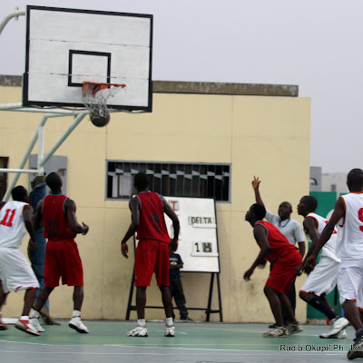 L’équipe de Delta (rouge) contre celle de Terreur (blanc) ce 12/06/2011 au stade des martyrs, lors du Championnat de 2ème phase de la ligue provincial de basketball de Kinshasa. Radio Okapi/ Ph. John Bompengo.
